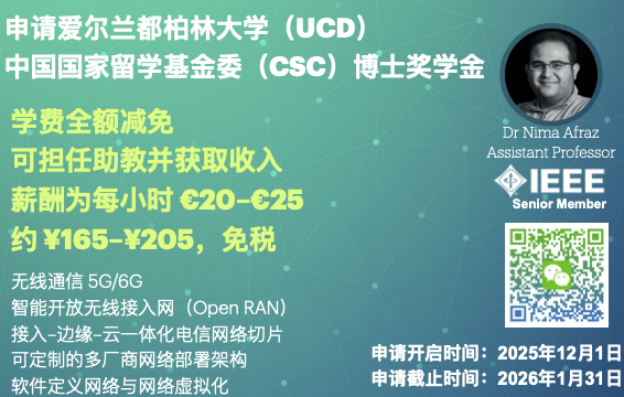 我们现面向中国优秀申请者开放 2026 年博士奖学金申请。入选者将获得 UCD 全额学费减免,并可通过参与助教(TA)工作获得收入,时薪 €20–€25(约¥165–¥205,免税)。
