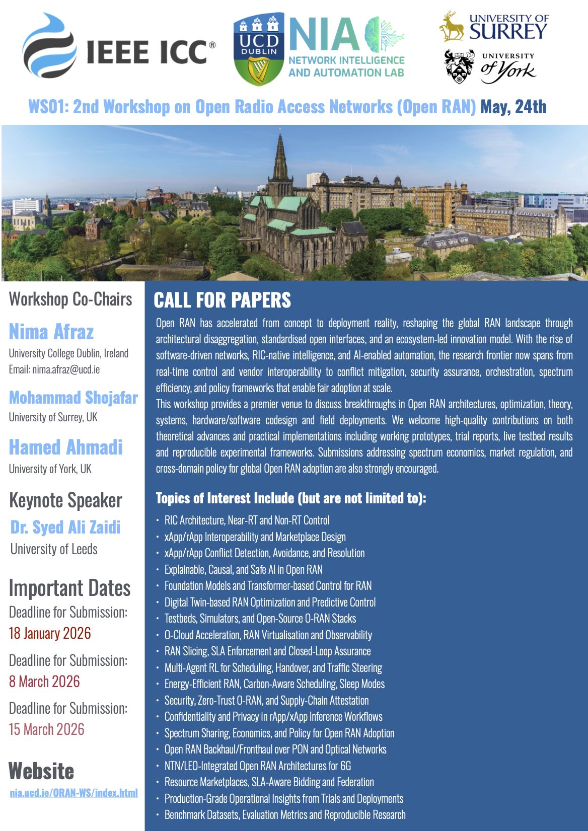The workshop is chaired by Nima Afraz (University College Dublin), Mohammad Shojafar (University of Surrey), and Hamed Ahmadi (University of York).